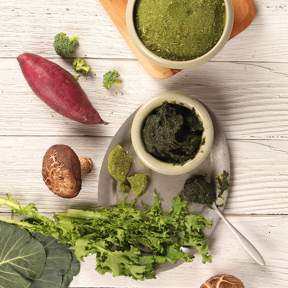 Pumpkin, sweet potato, carrot, cabbage, pear, broccoli, kale, banana, tomato, shiitake mushroom, lotus root, blueberry powder, prebiotics, spirulina, probiotics