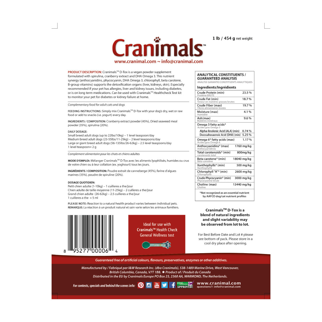 Cranimals DTOX provides a superior synergistic blend of key anti-inflammatory antioxidants (proanthocyanidins, phycocyanin, beta carotene,, proteins, vitamins (B group), minerals (Cu, Zn, Se, Fe, Mg) and enzymes (Suproxide dismutase) to support the vitally important detoxification organs (liver, kidneys and skin). This formula is ideal supplement to replace fish oil and multivitamin and multimineral supplements in one single step.