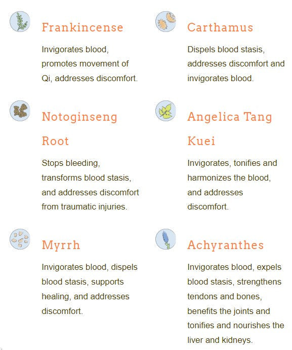 Proprietary blend of (notoginseng root, angelica tang kuei, frankincense, myrrh, carthamus flower, achyranthes root)