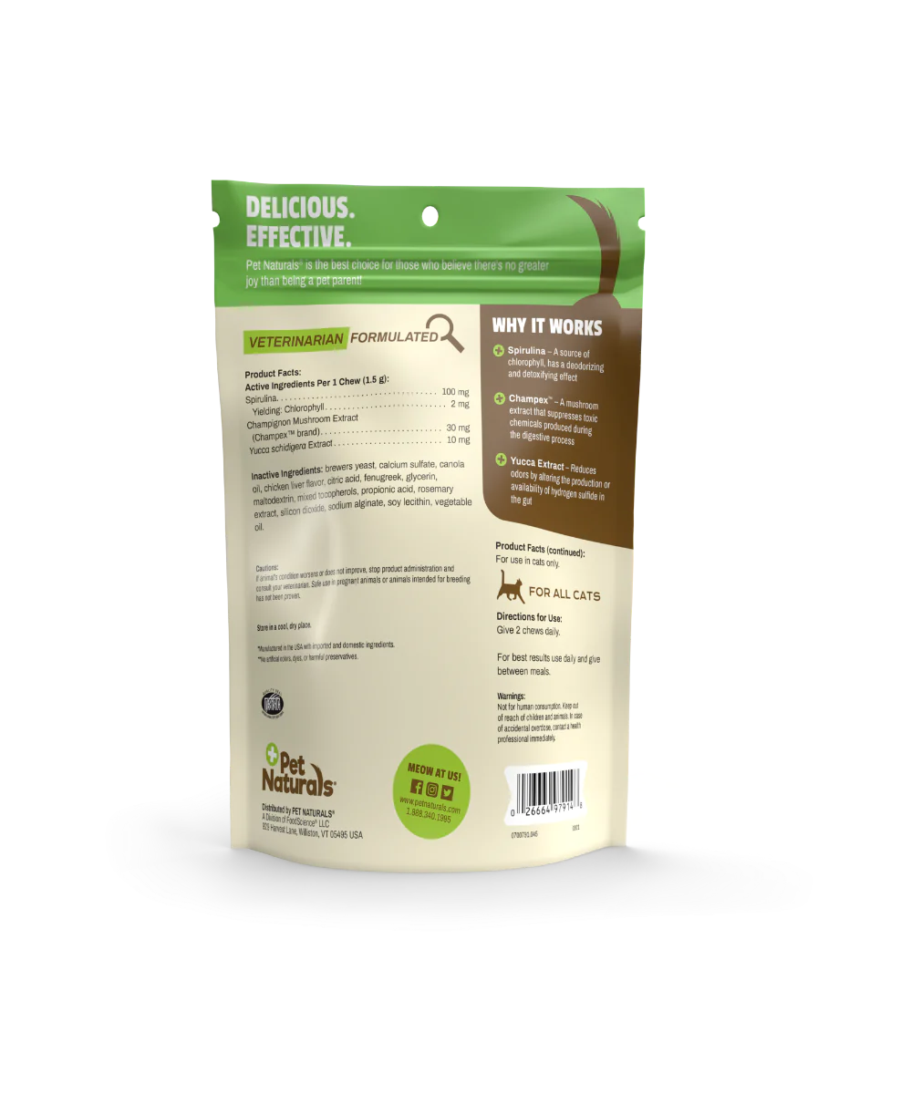 Kiss your feline friend’s foul breath goodbye with these yummy breath freshening chews! Clean Scat features natural deodorizers, including spirulina and champignon mushroom extract to suppress odor-causing chemicals in the stomach. These tasty chicken liver-flavored chews support healthy GI function to help freshen breath and reduce litter box odor.