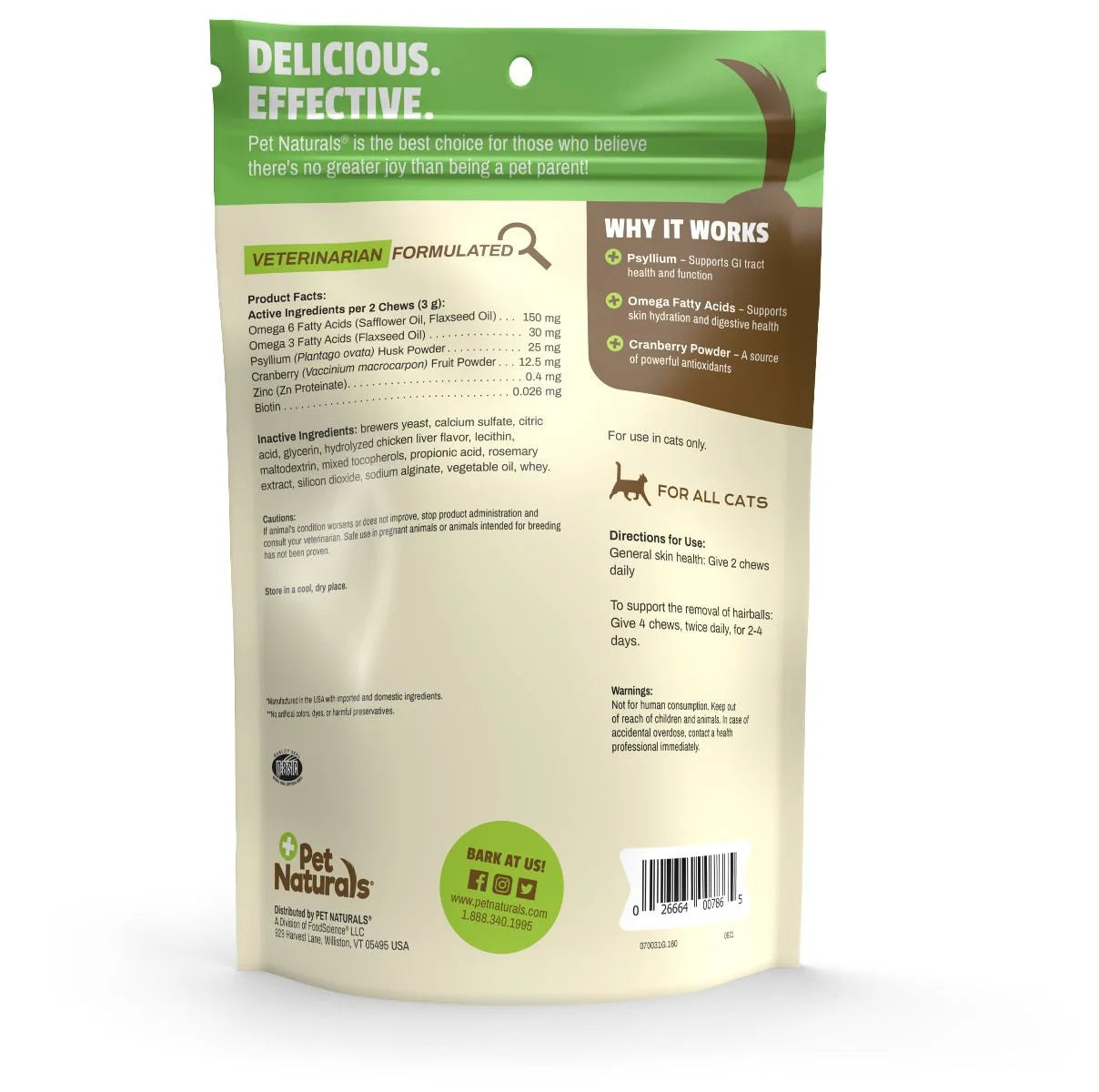 Your cat’s constant grooming can lead to hacked up hairballs and an unpleasant mess on the floor. Yuck! Hairball chews are specially formulated to help eliminate and prevent hairballs. Key ingredients, such as omega 3 and 6 fatty acids, biotin and zinc support skin, coat and GI health to minimize hairball formation. These delicious chicken liver-flavored chews are made without mineral oil or herbals that can have side effects in cats.