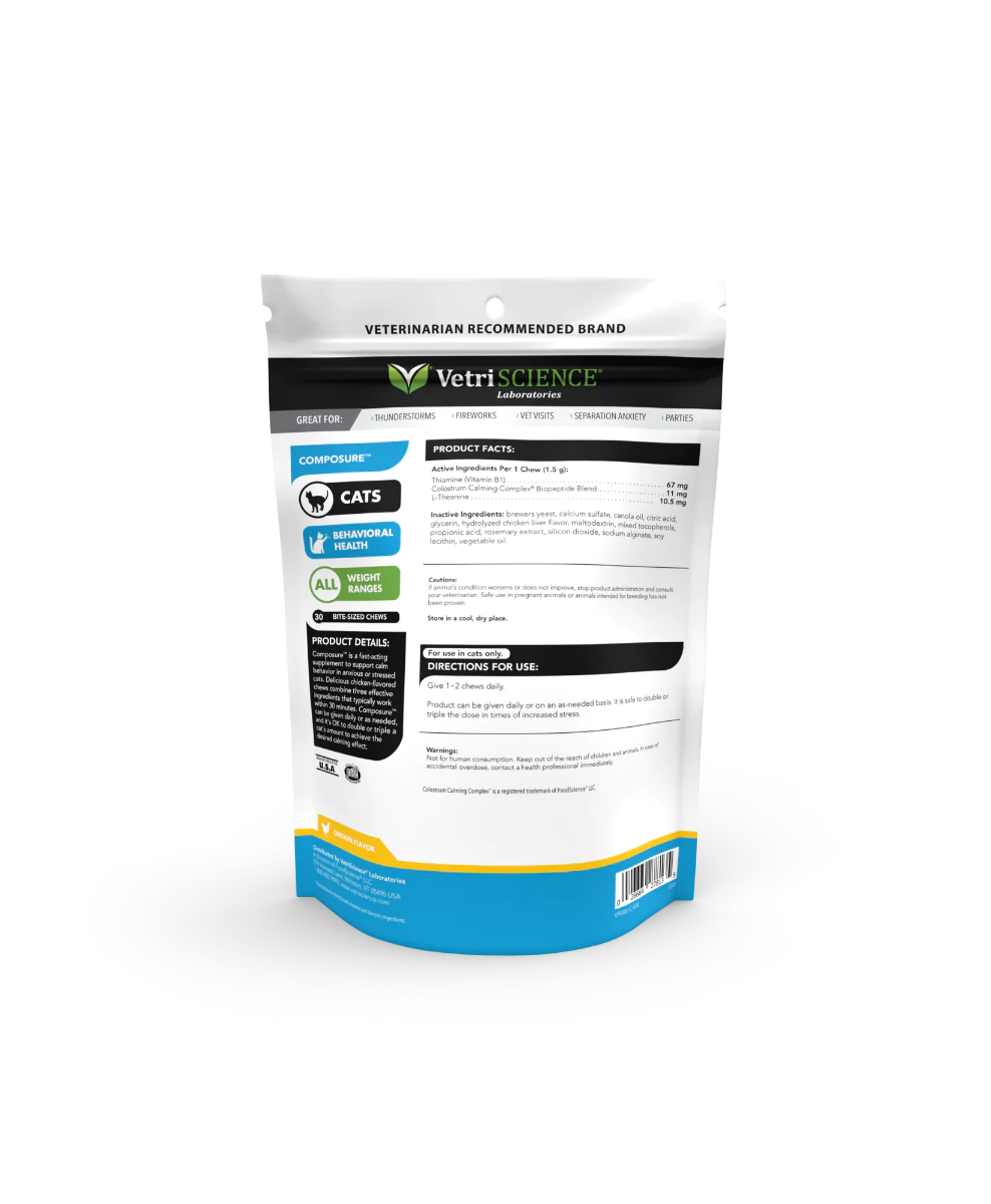 Patented Colostrum Calming Complex® Biopeptide Blend, Thiamine (Vitamin B1) and L-Theanine work together to support balanced behavior and a relaxed state of mind. These ingredients have been shown to help reduce stress and unwanted behavior. Composure™ Is made with naturally sourced ingredients in a delicious bite-sized chew that cats love!